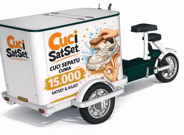 Cuci Satset hadir dengan gerobak listrik pertama di Indonesia yang siap cuci sepatu langsung di tempat kamu, cepat dan praktis.